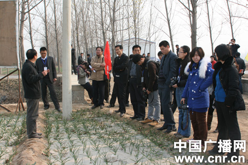 負責人在給記者同行們講解“無公害”大蒜與“有機”大蒜的區(qū)別(記者陳佳 攝)