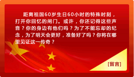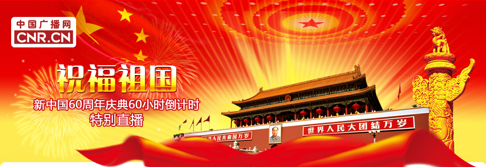 女:為了慶祝新中國60華誕,中國之聲也從此刻開始推出特別直播《祝福祖國》,我們將采用60小時倒計時的特別形式,和您一起迎來我們新中國60華誕。