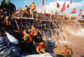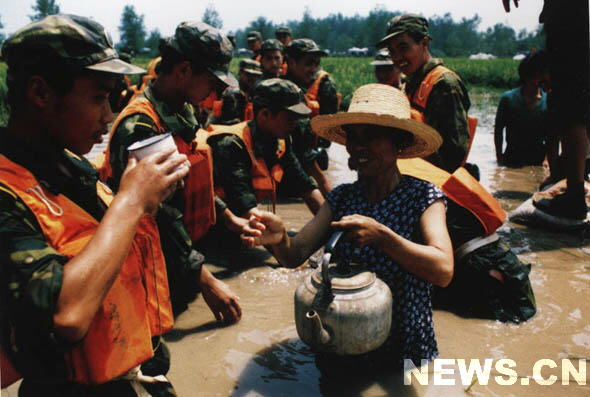 朱煦:現(xiàn)在距離新中國60周年慶典還有11個小時。11年前的1998年,中國遭遇了百年一遇的特大洪災(zāi)。那一年在江西、湖北、湖南的長江沿線,有三個顏色給人們留下了深刻的印象。一個是綠色,這是指戰(zhàn)員的軍衣。還有一個是橘紅色,這是指戰(zhàn)員和抗洪搶險軍民的救生背心。還有一個顏色是黃色,那就是洪水和戰(zhàn)士們身上的泥濘……