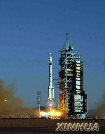 2003年10月15日,我國在酒泉衛(wèi)星發(fā)射中心進行首次載人航天飛行。9時整,“神舟”五號載人飛船發(fā)射升空。新華社記者李剛攝(圖片來源:新華網(wǎng))