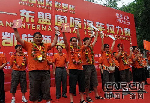 中廣網南寧10月12日消息(實習記者 申麗華)10月11日,2009中國--東盟國際汽車拉力賽在憑祥友誼關圓滿落幕并舉行隆重凱旋頒獎儀式.來自廣東、貴港、河池的車手以總積分排名前三分獲冠亞季軍。