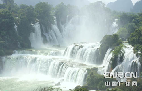 中廣網(wǎng)南寧10月6日消息(記者張江元)德天瀑布位于廣西大新縣中越邊境交界處的歸春河上游,它與緊鄰的越南板約瀑布相連,形成了世界第二、亞洲第一大跨國(guó)大瀑布。受今年第14號(hào)臺(tái)風(fēng)“黑格比”的影響,流域內(nèi)普降大到暴雨。豐沛的水量,給瀑布增添了無(wú)窮的活力。幾公里外已聞濤聲如吼,近觀(guān)則奔流飛瀉,盡顯磅礴之景象。
