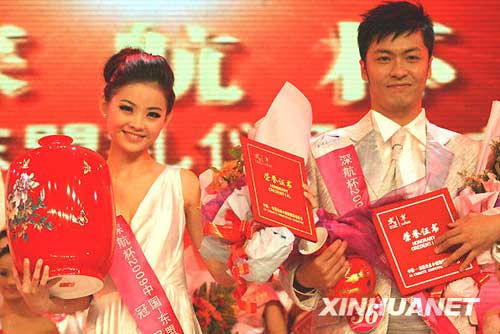 10月12日晚,2009中國——東盟禮儀形象大使選拔大賽總決賽的女子冠軍劉靜(左)和男子冠軍寧柯宇合影。新華社發(fā)(牛書培 攝)