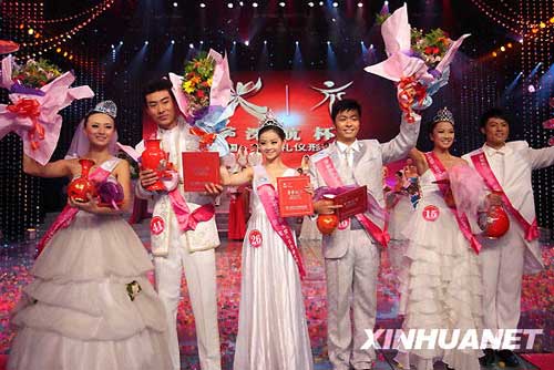 10月12日晚,榮獲2009中國——東盟禮儀形象大使選拔大賽總決賽的男女冠亞季軍合影。新華社發(fā)(牛書培 攝)