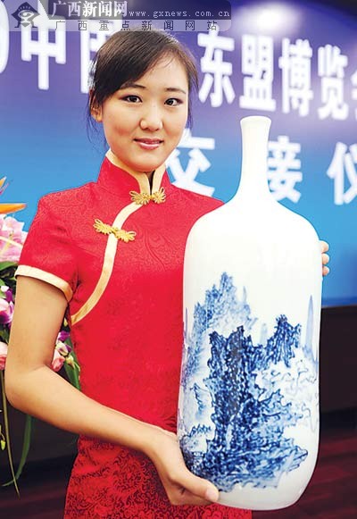 10月13日,第六屆中國-東盟博覽會國家政要及貴賓禮品——湖南省醴陵市紅玉紅瓷工藝瓷廠燒制的釉下“五彩瓷瓶”交接儀式在南寧舉行;顒蝇F(xiàn)場展示了黃、白兩色花瓶,瓶身圖案由鄭軍里等4名廣西知名畫家精心創(chuàng)作,取材主要為廣西少數(shù)名族和中國民間故事。(來源:廣西新聞網(wǎng))
