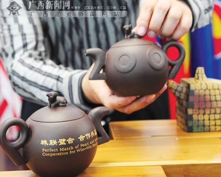 10月14日,第六屆中國-東盟博覽會國家政要及貴賓禮品——12件“陶人葛”紫砂壺及22件“風(fēng)生水起”主題系列陶瓷亮相南寧。(來源:廣西新聞網(wǎng))
