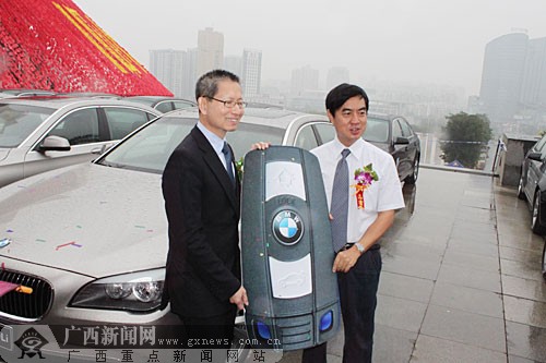 寶馬(中國)銷售副總裁許智俊先生(左)向廣西國際博覽事務局局長鄭軍。ㄓ遥┻f交“車鑰匙”。(來源:廣西新聞網(wǎng))