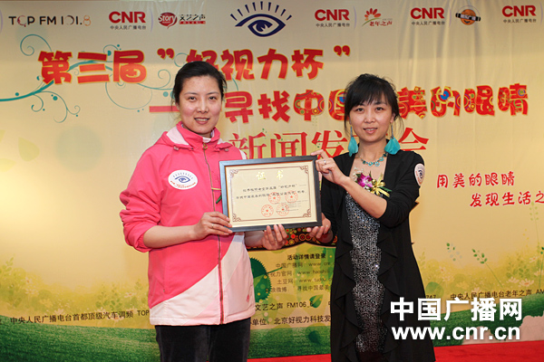 央廣都市文化傳媒有限公司總經(jīng)理孟昕(右)為杜麗頒發(fā)“愛眼公益大使”證書 中廣網(wǎng)記者涂傲 攝