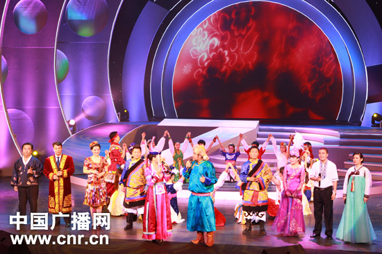 中央人民廣播電臺(tái)蒙藏維哈朝語播音員演唱歌曲《愛我中華》。