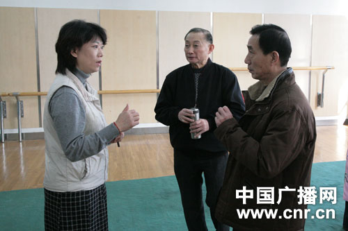 梅葆玖先生與戲曲導(dǎo)演孫愛青在晚會演出節(jié)目響排現(xiàn)場(李曉東 攝)