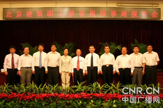 在中國建筑職工建設祖國事跡報告會上,北京市總工會副主席時純利、北京建筑工會主席宋麗靜、集團公司和一公司領導與巨曉林合影。