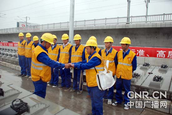巨曉林在京滬高鐵施工現(xiàn)場和工友一起接受作業(yè)票。