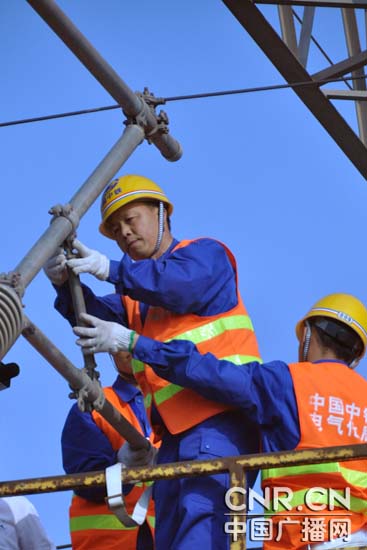 巨曉林在遷曹線施工中進行接觸網(wǎng)相關(guān)的作業(yè)。(記者 曾靈華 攝)