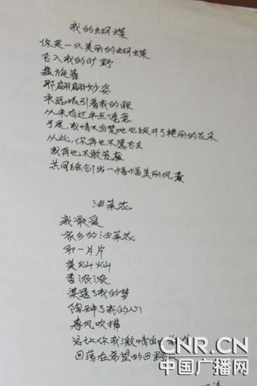 巨曉林經(jīng)常作詩,這是保存在他的筆記本里的兩首抒情詩(記者 曾靈華 攝)