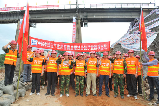 由于江西、福建省境內(nèi)普降大到暴雨,泥石流、山體滑坡突發(fā),鷹廈鐵路運輸安全受到嚴重威脅。中國中鐵電氣化局集團把險情當(dāng)成命令,把搶險當(dāng)成責(zé)任,在第一時間成立了搶險指揮部,從江西、福建、湖南等地迅速調(diào)集200多名搶險隊員火速奔赴一線。