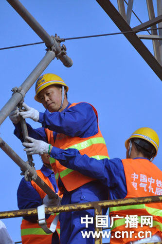 巨曉林和工友們在遷曹鐵路工地進(jìn)行電氣化施工