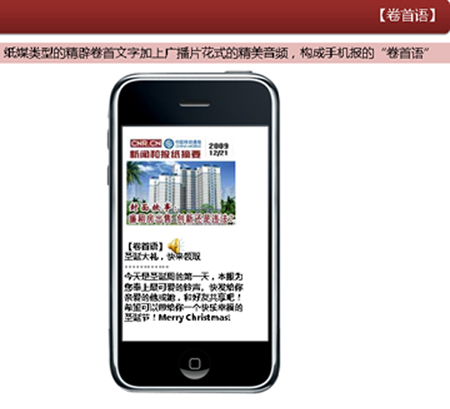 “卷首語”在手機(jī)報的第一幀中,紙媒類型的精辟卷首文字加上廣播片花式的精美音頻,構(gòu)成手機(jī)報的“卷首語”。根據(jù)時間及事件的變化,音頻可以選擇歷史珍惜聲音、事件報道現(xiàn)場聲、名人名家寄語等多種形式。