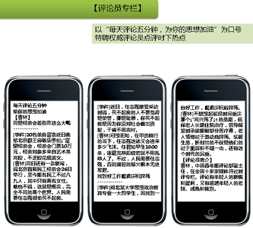 “評論員專欄”我們邀請了眾多社會知名評論員對當(dāng)天熱點(diǎn)事件進(jìn)行評論,目前曹景行、葉匡政、童大煥等已在我們的評論員行列。央廣手機(jī)臺還會根據(jù)不同的事件隨時更新評論員隊伍,使我們的評論既有思想深度,又不失新鮮活力。
