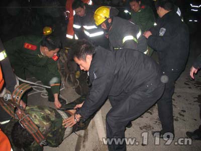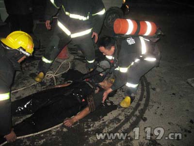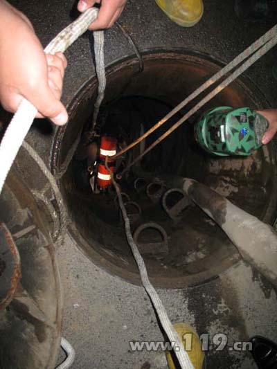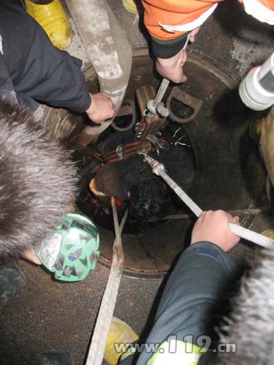 17時(shí)33分,陳鵬飛將安全腰帶、救護(hù)繩系到最上面一名被困者腰間并托舉出水面,由井上指戰(zhàn)員將其拉出。在隨后4分鐘內(nèi),其他3名被困人員被相繼救出。17時(shí)37分,在確認(rèn)污水井已無被困人員后,陳鵬飛安全出井。 |