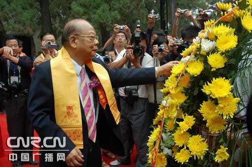 “志弘毅、重內省、明儒道、貴人本……篤信好學,承孔道而開思孟……”鼓樂悠悠、輕煙繚繞中,曾子第74代孫、中國全國人大常委會委員、香港金利來集團董事局主席曾憲梓,代表海內外所有宗親向遠祖獻禮,上香、奠爵。