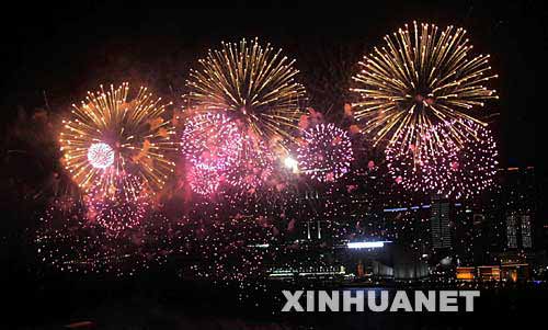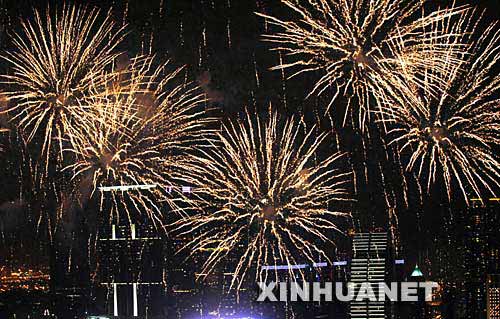 當(dāng)日,香港特區(qū)政府為慶祝國慶,在維多利亞港上空舉行煙花匯演。 新華社記者 吳曉初攝