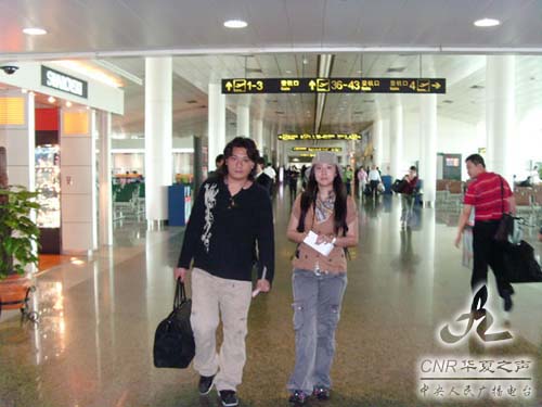 華夏之聲深圳編輯部主持人王思元(右)、歌手阿浪多杰在成都機場