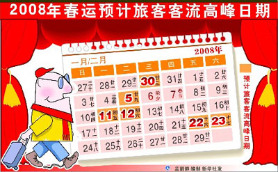 2008年春運(yùn)預(yù)計(jì)旅客客流高峰日期