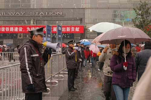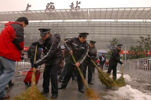 四天來(lái)的雨夾雪,車站廣場(chǎng)道路部分路面開始結(jié)冰。為了讓滯留、積壓在車站的旅客得到妥善安排,盡快回家,上海鐵警的干部和民警已連續(xù)多日通宵達(dá)旦地奮戰(zhàn)在火車站現(xiàn)場(chǎng),全力維護(hù)售、退票秩序及旅客的防滑安全工作。多名干部和民警因勞累生病,但仍堅(jiān)持在春運(yùn)保衛(wèi)的第一線。