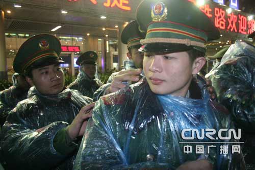 中廣網(wǎng)深圳1月31日消息(記者李強 通訊員彭凱符鐘) 在深圳火車站廣場寒冷的凍雨天氣中,在此進行春運執(zhí)勤的廣東邊防七支隊官兵,為了春運工作的順利進行和返鄉(xiāng)外來工的利益,在寒風凍雨中承受風吹雨打,徹夜奮戰(zhàn)力保春運。