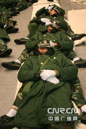 戰(zhàn)士們在互相幫助下穿上了雨衣