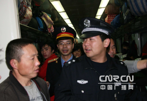 乘警與列車長(zhǎng)密切配合迎接客流認(rèn)真巡視涌擠的硬座車廂
