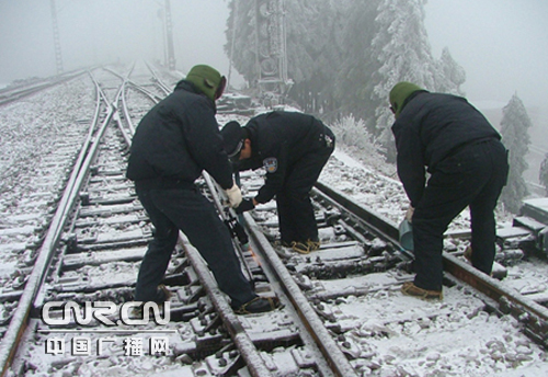 應急民警用撬棍和噴燈清除岔逢內(nèi)結(jié)冰,保證道岔閉合