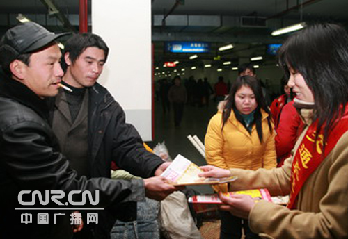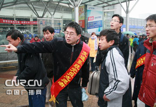 今天上午8點(diǎn)半,志愿者準(zhǔn)時(shí)在火車南站廣場(chǎng)集合,分成維護(hù)秩序、問訊指路、提供幫扶等五個(gè)小分隊(duì),隨即志愿者各就各位,又開始了一天忙碌而緊張的工作。青年志愿者小張和其他五名隊(duì)員帶上預(yù)先從家里、單位收集的一些報(bào)刊雜志,急匆匆趕到南站廣場(chǎng)地下停車庫的旅客臨時(shí)候車室,送給滯留旅客閱讀,以緩解乘客等候多時(shí)的焦慮心情;之后,他們又給旅客送上了一杯杯熱騰騰的姜茶,為寒冷中的旅客送上了一份溫暖。