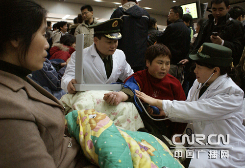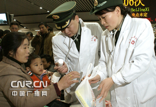“您的孩子哪里不舒服,是不是不停地咳嗽、還時(shí)常嘔吐?”這是廣東邊防七支隊(duì)衛(wèi)生隊(duì)軍醫(yī)正在深圳火車站候車室內(nèi)關(guān)心的詢問(wèn)著一位生病孩子?jì)寢尩那榫。今年,因華南地區(qū)遭受嚴(yán)重雪害,致使交通中斷、春運(yùn)受阻,數(shù)萬(wàn)北上的旅客被滯留在深圳火車站無(wú)法回家過(guò)年,滯留旅客在火車站候車室內(nèi)苦等數(shù)日,其中不少旅客出現(xiàn)了發(fā)燒、頭暈、胸悶、嘔吐等癥狀,正在深圳火車站負(fù)責(zé)春運(yùn)執(zhí)勤的廣東邊防第七支隊(duì)積極為滯留旅客開(kāi)展送醫(yī)問(wèn)藥活動(dòng),有效地保證了滯留旅客的身體健康。