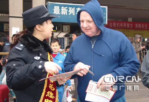 長(zhǎng)沙鐵路公安處民警為外國(guó)旅客朋友發(fā)放宣傳資料并提供咨詢服務(wù)