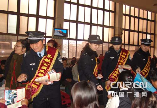 長(zhǎng)沙鐵路公安處團(tuán)員青年民警為旅客發(fā)放安全出行宣傳資料及警民聯(lián)系卡