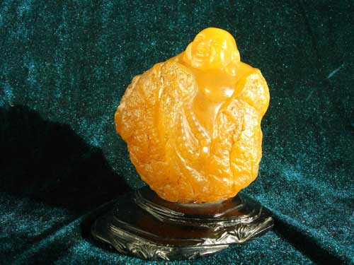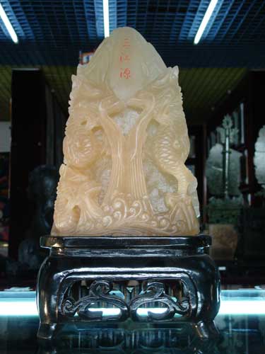 “河湟玉”俗稱(chēng)冰糖玉,產(chǎn)于青海省互助、平安縣境內(nèi)。 含有少量的氫氧化鐵。其硬度為2,密度每立方厘米2.3—2.5克。質(zhì)地細(xì)膩呈半透明或微透明狀,色澤變化豐富,有冰糖玉色、白色、棕紅色、淺褐紅色等,質(zhì)純色潤(rùn)、外表晶瑩透亮呈蠟狀光澤。由此原料所制作的大型雕刻作品《江河源》,作為青海省政府慶祝澳門(mén)回歸的禮品深受澳門(mén)當(dāng)?shù)卣案鹘缛耸康暮迷u(píng);大型雕刻作品《奮進(jìn)》、《三江源》均被人民大會(huì)堂青海廳收藏。小型工藝禮品牦牛、藏羚羊等,深受海內(nèi)外友人的青睞。 |