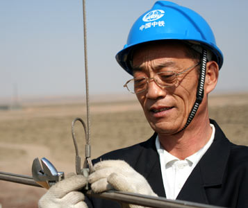 竇鐵成在10米高的鐵路電力作業(yè)車上檢察電纜(中國廣播網(wǎng) 余京津攝)