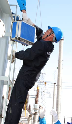 竇鐵成最經(jīng)常干的一項(xiàng)工作:蹲在地上測量地下埋藏的線纜的電壓是否正常。(中國廣播網(wǎng) 余京津攝)