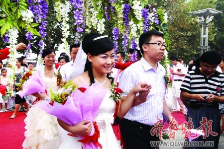 中廣網(wǎng)濟寧8月25日消息 由齊魯晚報濟寧記者站聯(lián)合共青團(tuán)濟寧市委、濟寧市婦聯(lián)共同主辦的“華宸房產(chǎn)奧運中國結(jié)”濟寧青年集體婚禮在濟寧市文化廣場火爆開場,22對新人在北京奧運會開幕的當(dāng)天喜結(jié)連理