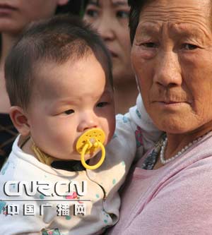 曲阜開(kāi)城儀式外,一對(duì)祖孫聚精會(huì)神的觀看開(kāi)城儀式。(中廣網(wǎng) 蔡波攝)