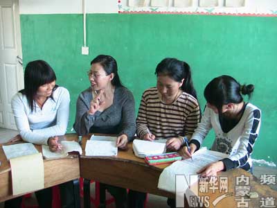 9月10日,孫月光(右三)在和教師研究聾啞兒的康復(fù)教學(xué)。(李富 攝)