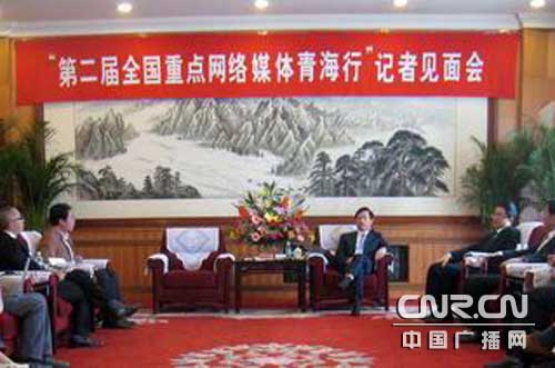青海省委書記強衛(wèi)與第二屆全國重點網(wǎng)絡(luò)媒體青海行記者見面。(攝影:中廣網(wǎng)記者張立新)