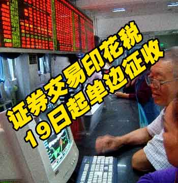 經(jīng)國務院批準,財政部決定從2008年9月19日起,對證券交易印花稅政策進行調(diào)整,由現(xiàn)行雙邊征收改為單邊征收,稅率保持1‰。