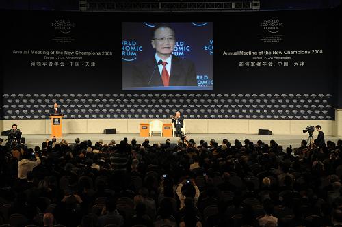 9月27日,世界經(jīng)濟(jì)論壇2008年新領(lǐng)軍者年會(huì)在天津?yàn)I海新區(qū)開幕。中國國務(wù)院總理溫家寶出席開幕式并致詞。新華社記者 王建華 攝