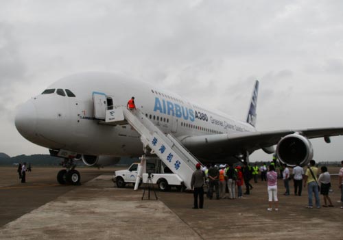中廣網(wǎng)11月3日珠海消息(記者王磊 張勁濤 余京津)世界上最大的雙層客機(jī)——空客A380經(jīng)過12個多小時的飛行,今天上午降落在珠海機(jī)場,參加第七屆中國國際航空航天博覽會。 來自法國的這架飛機(jī)一降落,就成為珠海航展的明星。該架測試飛機(jī)的名字叫生產(chǎn)序列號001,是第一架出廠的A380飛機(jī),目前仍在世界各地做數(shù)據(jù)測試飛行。