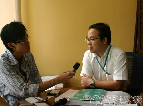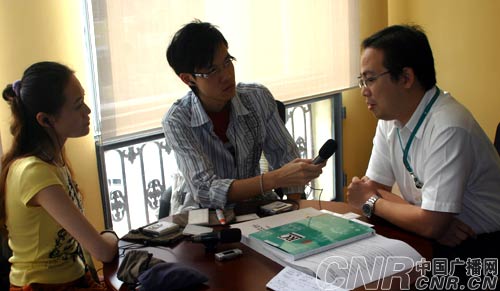 記者趙婷婷、王浩在采訪澳門特別行政區(qū)政府文化局副局長陳澤成