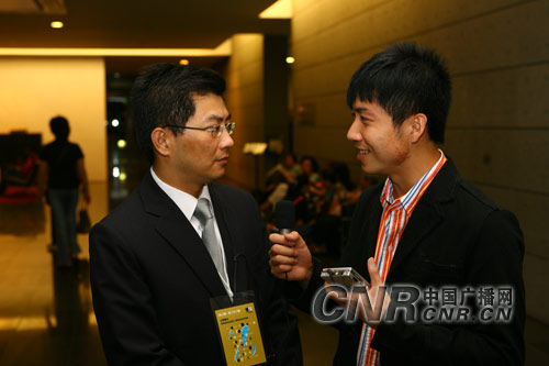 10月21日,《金光燦爛──徐小鳳與澳門中樂(lè)團(tuán)》在澳門文化中心綜合劇院舉行。在演出開(kāi)始前,中央臺(tái)華夏之聲記者小班采訪了澳門國(guó)際音樂(lè)節(jié)負(fù)責(zé)人林小白先生(左)。 中廣網(wǎng)記者李洪濤 攝