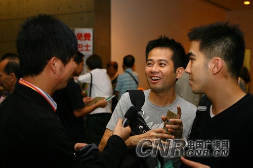 10月21日,《金光燦爛──徐小鳳與澳門中樂團》在澳門文化中心綜合劇院舉行。眾多徐小鳳的歌迷來到演出現(xiàn)場,香港歌迷更是跨海而來。據(jù)了解,許多香港歌迷都買了徐小鳳5場演唱會的票,準(zhǔn)備場場不落地現(xiàn)場聆聽偶像的歌聲。圖為中央臺華夏之聲記者小班采訪香港歌迷。 中廣網(wǎng)記者李洪濤 攝