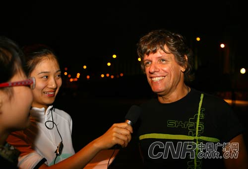 27日,來自葡萄牙的“踢吧”搖滾樂隊(duì)在激昂熱烈的樂曲聲中,為澳門搖滾樂迷奉獻(xiàn)了一場(chǎng)極富激情、活力的搖滾樂演唱會(huì),南灣湖廣場(chǎng)再一次迎來了一個(gè)不眠之夜。圖為中央臺(tái)華夏之聲記者宋薇采訪樂隊(duì)創(chuàng)始人之一、吉他手施·彼得(右)。 中廣網(wǎng)記者李洪濤 攝